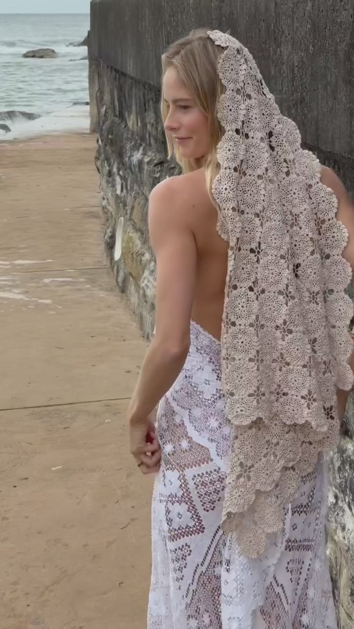 Hand-crafted from vintage crochet lace, this piece drapes softly over the hair and shoulders, framing the body with intricate floral motifs and a scalloped edge worn smooth by time. Each veil carries its own history; subtle variations in tone and texture that make every piece entirely one of a kind.